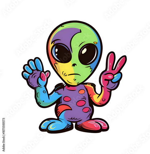 © Rakesh, Obraz premium Rainbow-Colored Cartoon Alien Waving Peace Sign