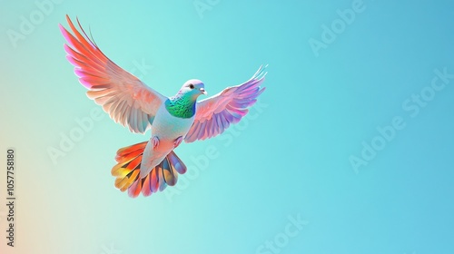 © Marry93, Obraz premium Rainbow-colored dove in mid-flight, isolated on a clear blue background, surrounded by faint clouds and light