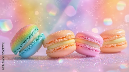 © Ibad, Obraz premium Rainbow-colored macarons on pastel backgrounds