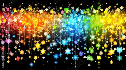 © Terlalu, Fototapeta premium Rainbow confetti and stars falling on black background.