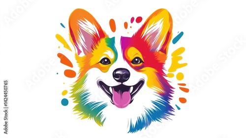 Naklejka premium Rainbow Corgi portrait, playful, white background, vibrant art, pet design