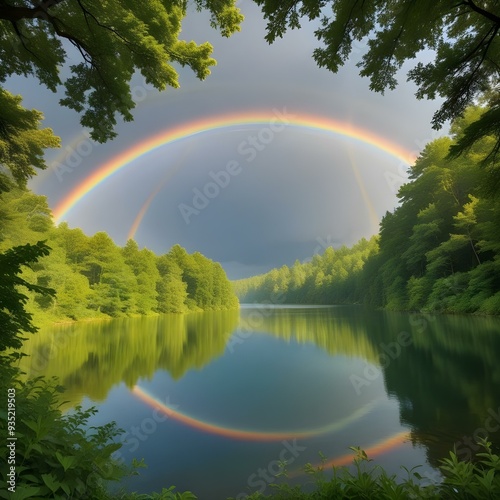 Naklejka premium Rainbow Double Over Lake Natural Spectrum Reflections on Water Surrounded by Trees