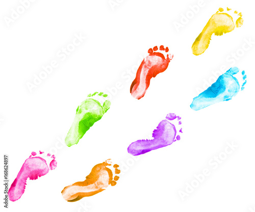 © component, Fototapeta premium Rainbow foot prints kid colorful set isolated on white background. Many fingerprint or stamp texture artwork of kids for education and journey. Bottom view. Close up.