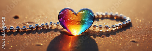 Naklejka premium Rainbow glass heart on sandy light background, glass beads. Red, orange,...
