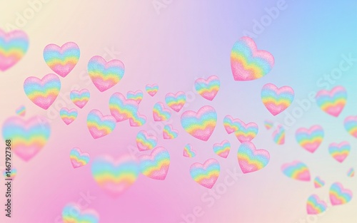 © amrets, Fototapeta premium Rainbow gradient glitter hearts float gently on a pastel, softly blurred gradient background