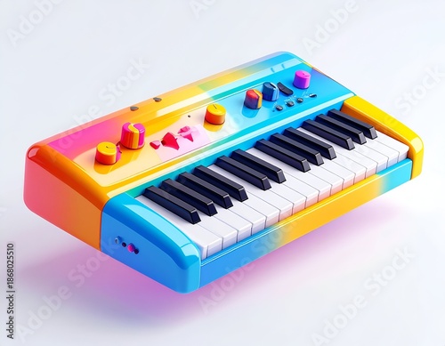 © nana, Fototapeta premium Rainbow-hued synthesizer with knobs and keys, angled in perspective