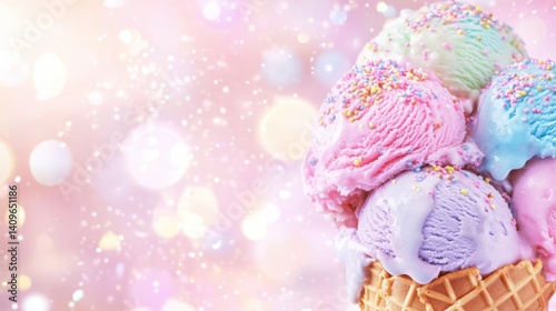 Fototapeta premium Rainbow Ice Cream Cone Dreamscape: a vibrant array of pastel ice cream scoops cascade from a crispy cone, shimmering with a sprinkle of sugary delight against a dreamy background.