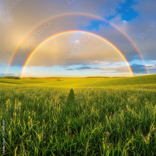 Naklejka premium Rainbow Images HD – Double Rainbow Over Green Fields with Sunlight | Rainbow...