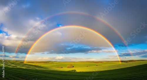 Naklejka premium Rainbow Images HD – Double Rainbow Over Green Fields with Sunlight | Rainbow...