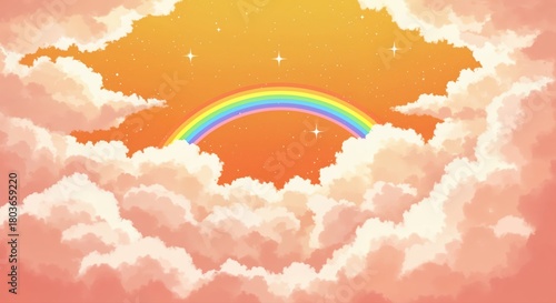 Naklejka premium Rainbow in the Clouds: A vivid rainbow arches gracefully across a pastel sky, nestled within fluffy clouds, symbolizing hope and joy
