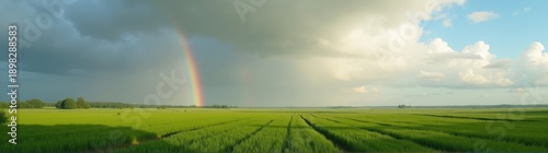 © Roman, Fototapeta premium Rainbow in the sky over a field of green grass