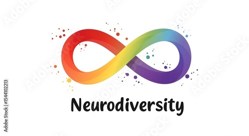 © Autism in Focus, Fototapeta premium Rainbow infinity symbol logo with neurodiversity text representing autism awareness inclusion and cognitive empowerment
