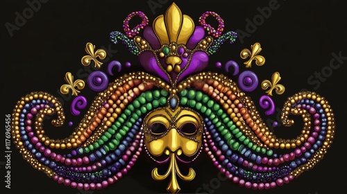 Fototapeta premium Rainbow label made with bead strings, Fleur de Lis sign, carnival golden venetian face mask in jester tomfool hat. Design element with text for Mardi Gras decoration.