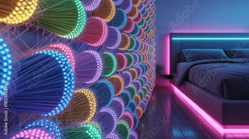 Naklejka premium Rainbow Light Strings Above Bed: Tranquil Bedroom Interior with Colourful Accent Decor