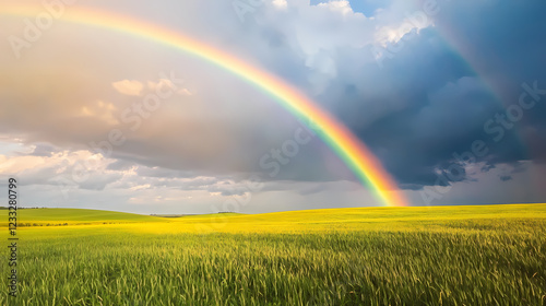 © Thiago, Naklejka premium Rainbow lighting up a cloudy sky after a passing rainstorm, casting soft colors on green fields. Rainbow Fields. Illustration
