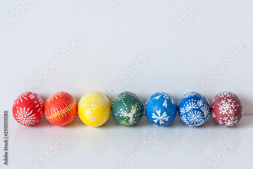 © Regina, Obraz premium Rainbow line of easter eggs on white background with reflection. Easter holiday concept. Still life with traditional Marguciai, decorated Easter eggs. Copy space.