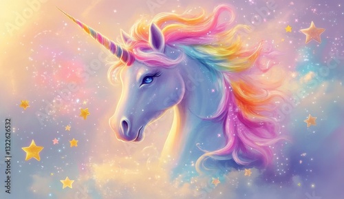 Fototapeta premium Rainbow maned unicorn portrait against a pastel sky, sparkling stars and glitter. Whimsical, magical, dreamy art