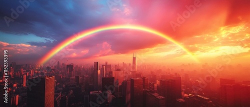 © Ishika, Fototapeta premium rainbow over a city skyline at sunset