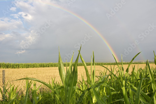 © brszattila, Naklejka premium Rainbow over a field during summer