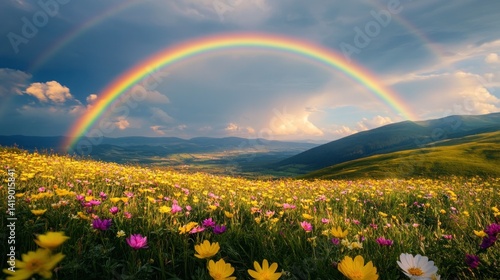 Naklejka premium Rainbow over a Vibrant Wildflower Meadow in the Mountains