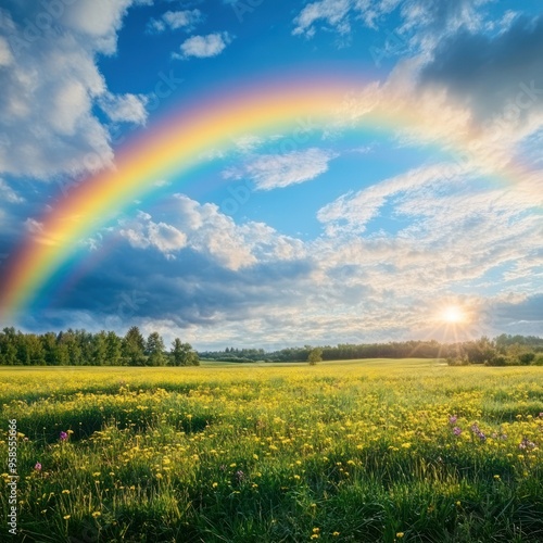 Naklejka premium Rainbow over field and meadow, beautiful rural spring scenery