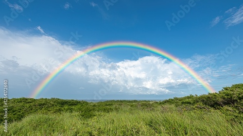 Naklejka premium Rainbow over grassy dunes, clear sky, vibrant colors, scenic landscape,...