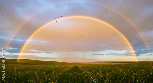 Naklejka premium rainbow over green field