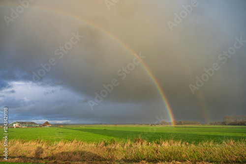 Fototapeta premium Rainbow Over Green Field and Farmhouse, Den Hoorn, Texel, Netherlands