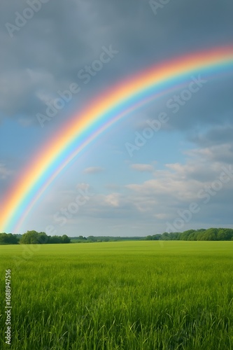 © Pixelra Studio, Obraz premium rainbow over green field under cloudy sky