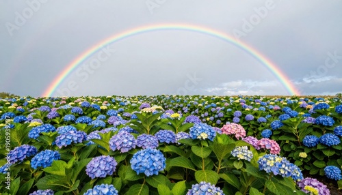 Fototapeta premium Rainbow over hydrangea fields nature photography scenic landscape colorful blooming plants vibrant environment