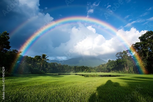 © Bujang, Naklejka premium Rainbow over lush green rice paddy.