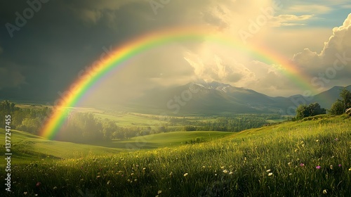 © Masok, Naklejka premium Rainbow over mountain meadow
