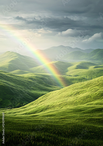 © Beauver, Obraz premium Rainbow over rolling green hills and mountains.