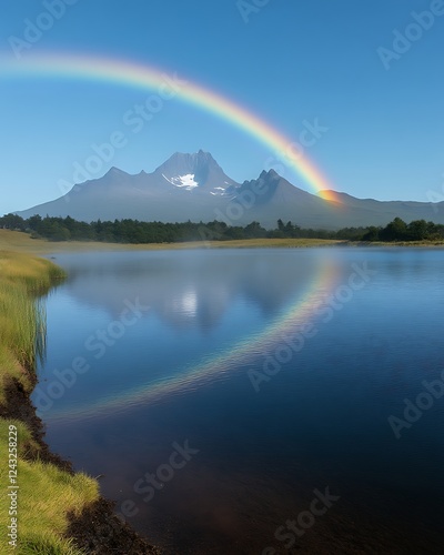 © Aslob, Naklejka premium Rainbow over serene lake and mountain.
