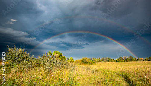 Naklejka premium Rainbow over the prairie field