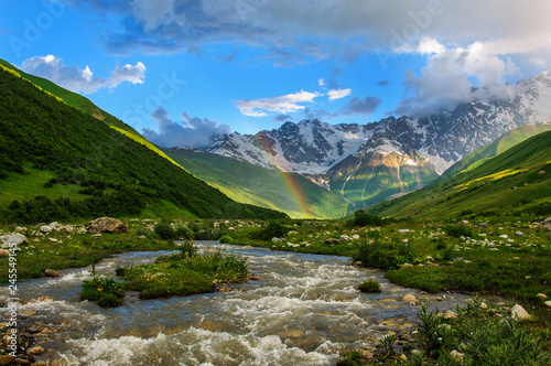 © tns2710, Obraz premium Rainbow over the rapid river and the snow-capped mountains. Georgia