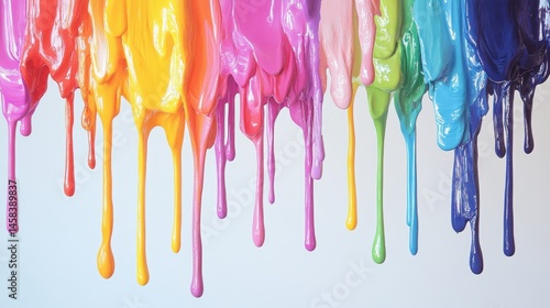 © Joesunt, Naklejka premium Rainbow paint flows: A vibrant display of multi-colored paints cascades downwards, symbolizing creativity and a spectrum of ideas.