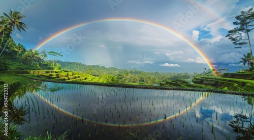 © adri, Naklejka premium Rainbow Reflected in Rice Paddy Water