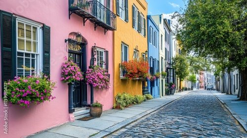 Naklejka premium Rainbow Row, Charleston, South Carolina: A picturesque street of colorful historic houses.