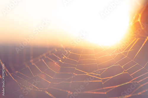 © dore art, Obraz premium Rainbow spider silk against sky and sun, selective focus.