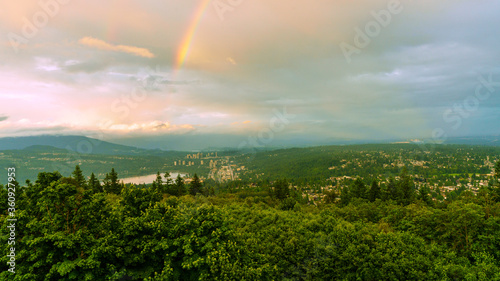 Obraz premium Rainbow tail highlights dark clouds over distant mountains
