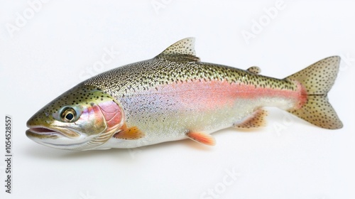© Vitalii But, Naklejka premium Rainbow Trout known as Oncorhynchus mykiss is prominently showcased against a white background highlighting its striking colors and patterns. Its detailed features are clearly visible.
