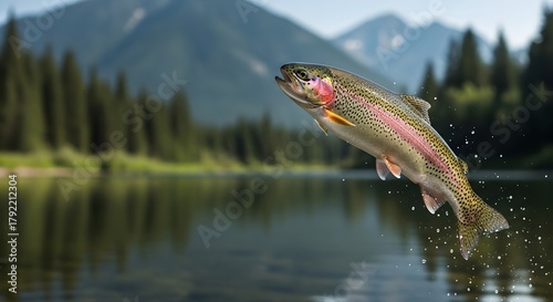 © ArtSync Studio, Fototapeta premium Rainbow Trout Leaping Above a Calm Lake Surface Surrounded by Forest Trees