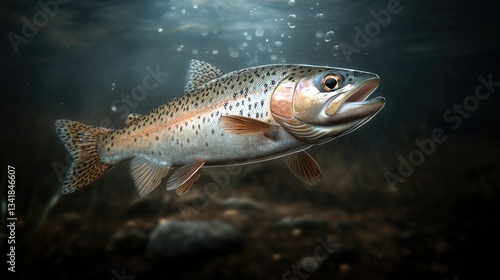 Naklejka premium Rainbow trout swimming gracefully in a serene underwater environment with bubbles rising around it during a calm afternoon