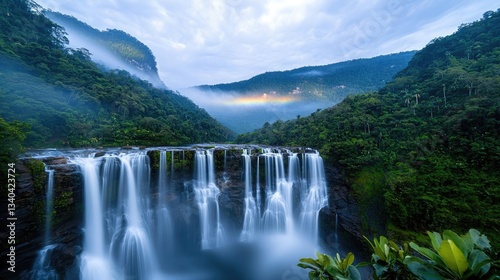 Fototapeta premium Rainbow waterfall landscapes dramatic concept. A serene waterfall cascading through lush greenery under a misty sky.