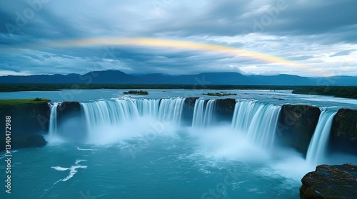 © Jiraporn, Fototapeta premium Rainbow waterfall landscapes pristine concept. Stunning waterfall under a dramatic sky with a rainbow creating a serene atmosphere.