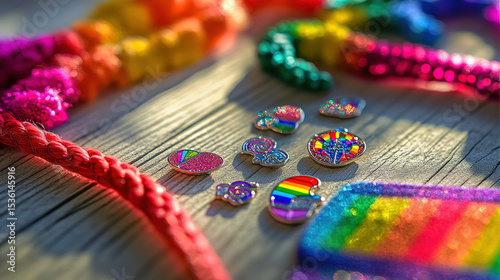 Fototapeta premium Rainbow Wristband and Pride Enamel Pins on Wood Surface Symbolizing Personal Pride and Celebration