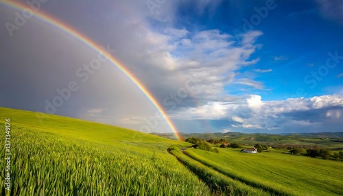 © Arfin Studio, Obraz premium Rainbows Arching Over Green Hills After a Storm in Fresh Vibrant Colors