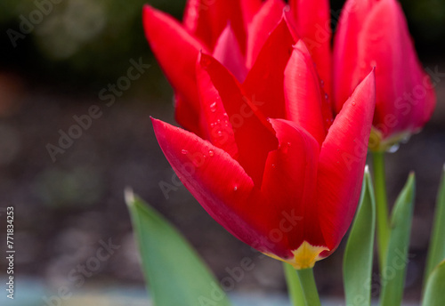 © couragesings, Naklejka premium Raindrops and Red Tulips