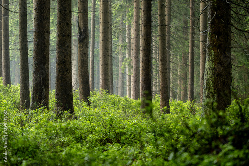 © LukaszGasiecki, Fototapeta premium Raindrops cascade through pine branches onto lush green blueberry bushes below, creating a serene and refreshing atmosphere in this peaceful coniferous forest scene.
